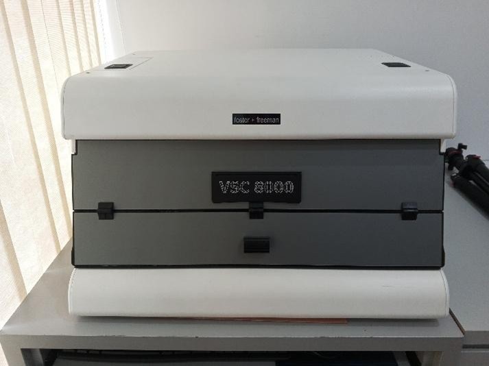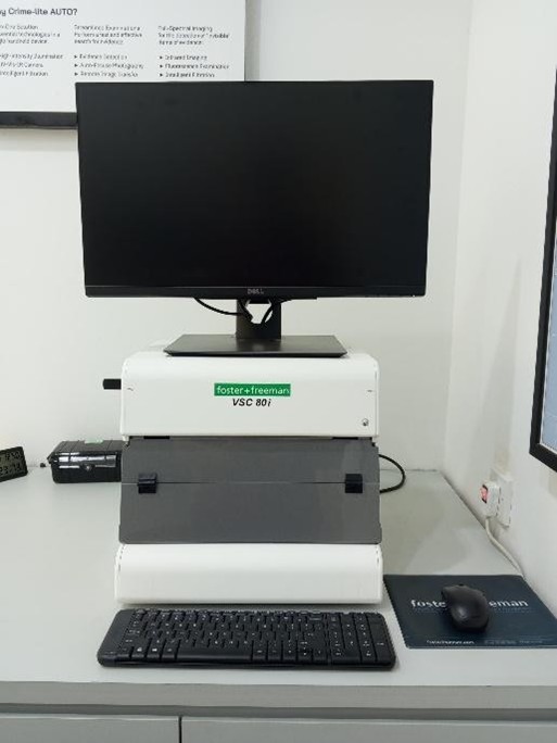 VSC 8000 merupakan workstation pemeriksaan dokumen dari Foster+Freeman. Alat ini dirancang untuk memeriksa dokumen dengan teknik pencitraan multispektral dari ultraviolet hingga inframerah. VSC 8000 dilengkapi dengan kamera resolusi tinggi, panggung XY terotomatisasi, topografi permukaan dokumen 3D, spektrometer, serta perangkat lunak canggih untuk analisis lanjutan. Alat ini digunakan untuk mendeteksi pemalsuan, memverifikasi fitur keamanan, menganalisis tinta, dan melakukan perbandingan dokumen